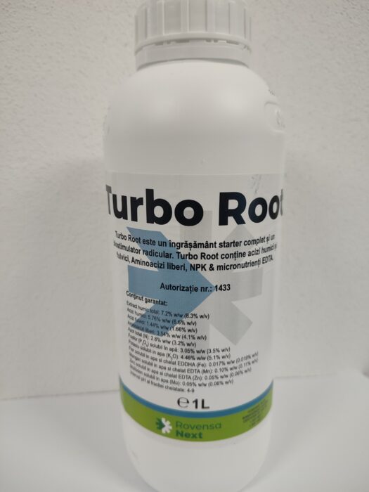 Turbo Root este un fertilizant starter complet si un biostimulator radicular. Aceata contine o combinatie echilibrata de acizi humici si fulvici, aminoacizi liberi, macroelemente NPK si microelemente chelatate EDTA, menita sa stimuleze cresterea viguroasa a sistemului radicular si a partii aeriene a plantei.